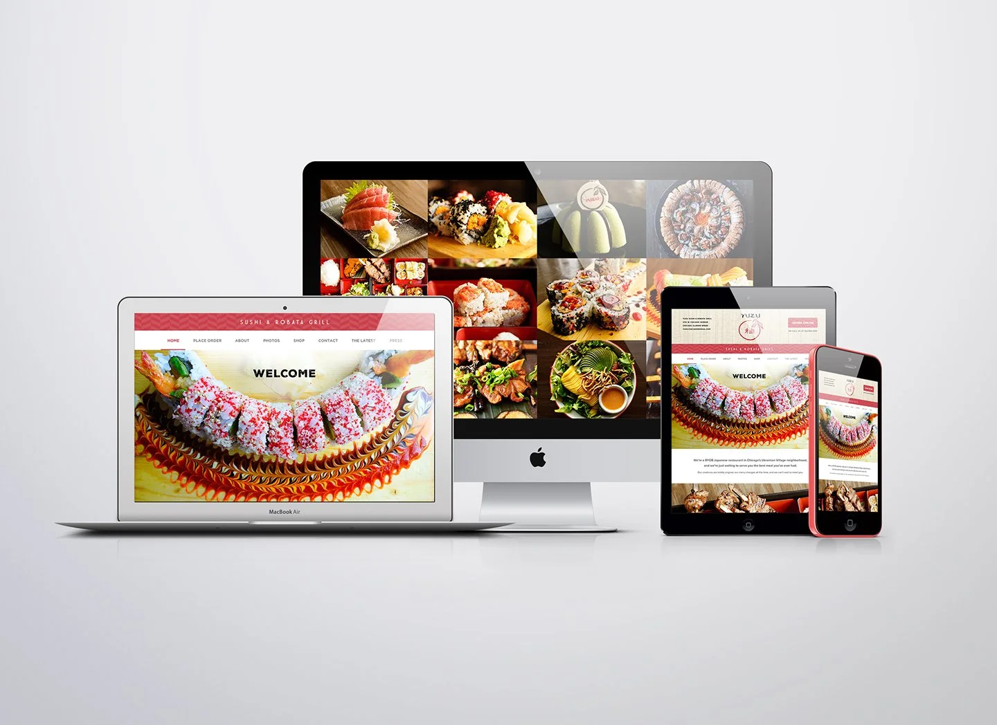 The typical plastic cover slips were discarded, and the menu was redesigned as a 8.5x5.5 saddle stitched booklet for people to intimately flip through. The menus were printed on water-resistant paper (similar to vinyl) still making them spill-proof. The design itself was spruced up by adding more trendy graphic elements that effectively related to the restaurant's atmosphere and decor. As part of the art direction rebrand, a pattern graphic was used and graphically resembles the decorative plate design that results from a toothpick being dragged through dipping sauce -- emulating Yuzu’s food presentation style.